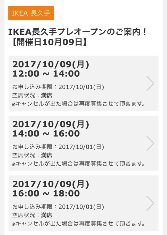 長久手IKEA?プレオープン募集開始 モノ X Facebook はてブ LINE コピー 2017.09.302017.10.01 とうとう始まりました、長久手IKEAのプレオープンの募集‼️オープンは10月11日ですがその2日前からプレオープンのとのこと。 しかし、その募集は9/29からですがすぐに満席に?10/10も同様に満席にです。二時間の入れ替え制のようですね。 残念ですがキャンセルが出るのを待つしかないようです?イオンモールの時と同様にしばらくは近くには行かない方が良さような予感?????? 関連