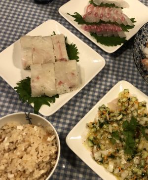 骨は一回フライパンで焼いてから鯛めしに。柵は刺身、カルパッチョ。あとは昆布締めして棒寿司に。