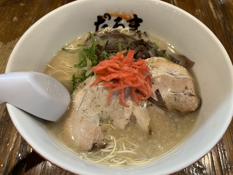 ソーメンのような細麺に脂が残る豚骨、それはど臭いはない。チャーシュー2枚、キクラゲ、ネギ、紅生姜はセルフという鉄板。まぁ可もなく不可もなく‥と言いながら「替え玉(150円)硬めで」と店員さんにお願いしてしまった(笑)