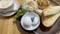 パンは暖かくて美味しいですがボリューミーですね、てっぺんにマーガリン、サイドにはポテトサラダ、謎のコーンスープ(笑)インパクトはあります。あとテーブルにメープルシロップ(たぶんケーキシロップ)で味変できます👍飲み物に追い金なしでコレならありですね。