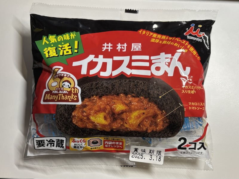 先日スーパーでイカスミまんを見つけたので買ってみました。どうやら24年の8月から発売開始しており冷凍と冷蔵の2種類があるようです。ともに2個入り。