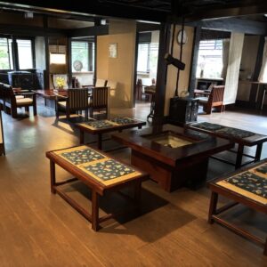 朝ごはんはやはり鉄板の朴木味噌とふぐの一夜干しあとは焚き物、刺身蒟蒻、小鉢など。これとは別に白ごはんとみそ汁、茶わん蒸しとまずまず満足の内容です。食後にコーヒーがロビーでいただけます。