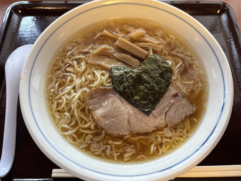 来ました。素朴な感じの中華そば。刻みネギがスープ表面に浮かび、海苔、シナチク、チャーシューとシンプルですね👍海苔がハート形なのが??です。観光客用?スープは醤油ベースで麺は細ちぢれ。昨日の麺屋しらとりより好感が持てますね。