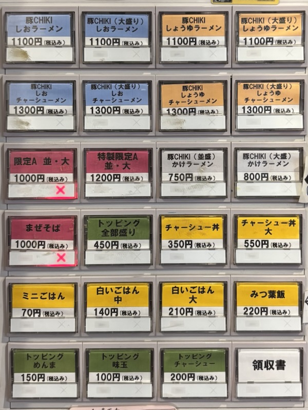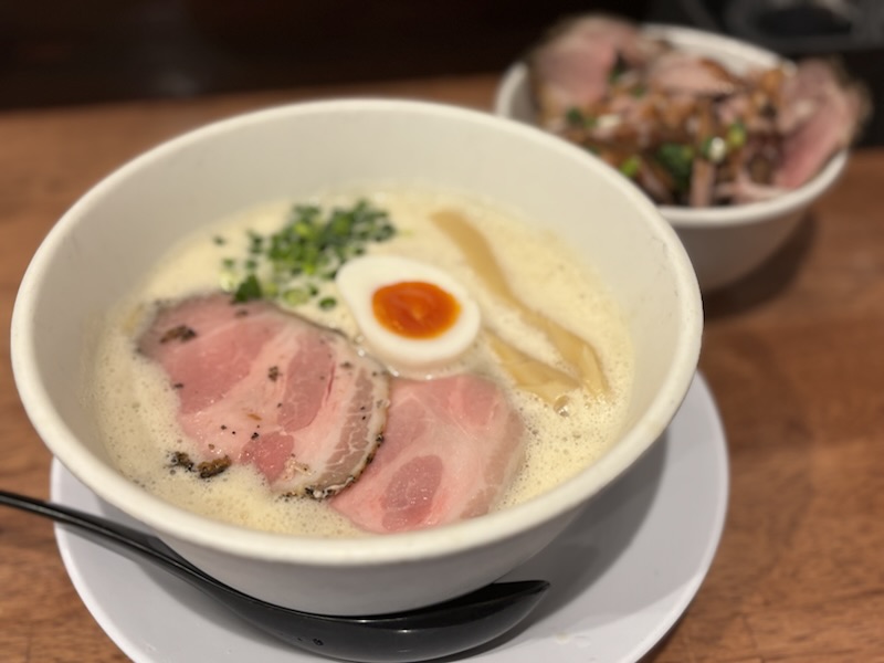 カプチーノ系なので豚CHIKIしおラーメン1,100円とチャーシュー丼350円にしてみました。食券をもって席に着きます。店内は厨房があって5席、3席のカウンター囲み離れたところに4席のカウンターがもう一か所あります。席に着くと麺を普通もしくは平打太麺かを選べます。今回は平打太麺にしてみました。自家製とのこと。