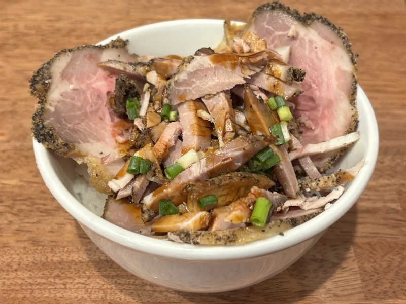 チャーシュー丼は勢いに任せて頼んでみました。白ごはんに刻みチャーシュー、ネギ、タレという構成。チャーシューが冷たくて硬い&脂が溶けてこないのであんまりお勧めではないですね。