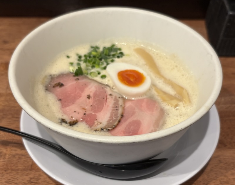 来ました~🍜、これが奈良を代表するみつ葉のラーメンか!具の方ですがチャーシュー、ネギ、卵、シナチク。スープは豚と鶏の泡立てたものに注文の時に選んだ平打太麺になっています。チャーシュー丼よりチャーシューは温まっていて胡椒もビリっとして美味しかったです。メンマもレベルが高かった!もちもちの麺とスープも相性が良かったです。