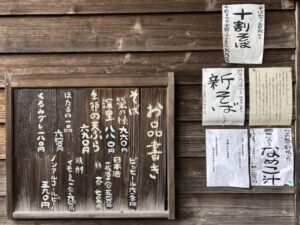 開店は11時からなので少し道の駅小谷によって20分前に着きましたがすでに駐車場は一杯で20組ほどの待ちです。名前を書いて車で順番を待ちます。そばの殻ごと引いた深里と更科の蛍の緑があります。今回は特別に新そば祭りなので限定で十割そばもあります。新そば祭り限定でなめこ汁もありました。