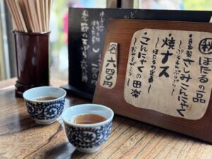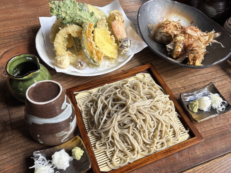 窓際の席に通されて悩みましたが深里880円、蛍の緑960円、くるみダレ180円(普通のそばつゆも貰たったので+100円)、季節の天ぷら690円、焼ナス640円を注文しました。お茶はセルフ、唐辛子🌶と岩塩、お持ち帰りの容器はお茶の横にありました。