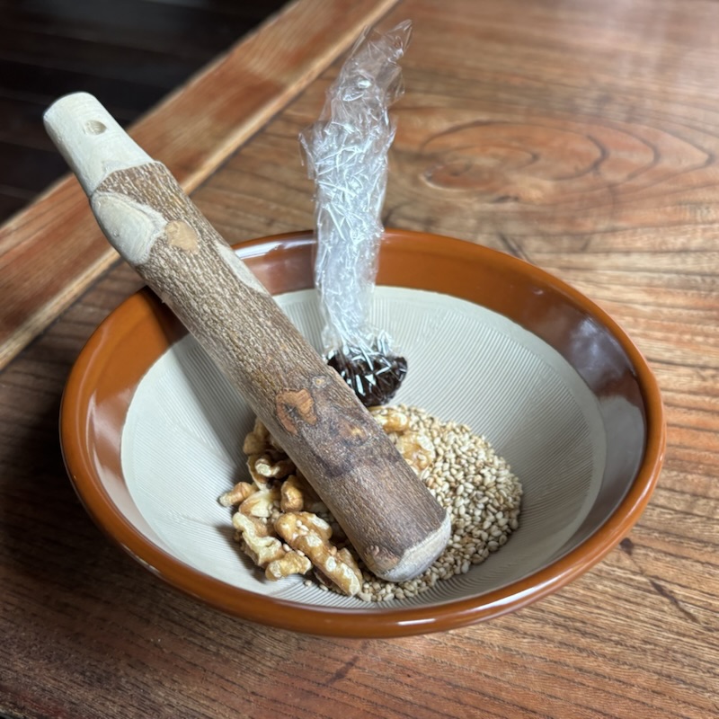 くるみダレのすり鉢が出てきました。胡麻と胡桃でペースト状にまでなればラップにくるまれた味噌を入れて混ぜます。