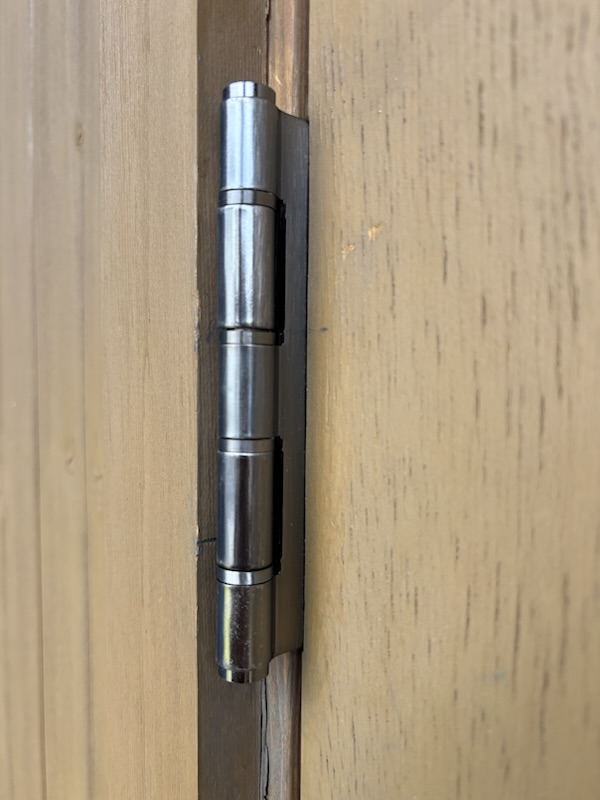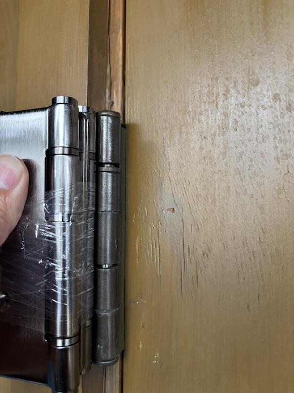 ワンダーデバイスを建てて14年目、とうとう玄関ドアが悲鳴を上げだしました。ドアを閉めるとキューキューいいますね。ドアが下がってきて下部の干渉しているようです。これは前から築いていたのですが丁番が摩耗して下がってきているからなんですよね。ということでBESSに連絡して玄関ドアの丁番を手配してもらいました。丁番3セットとねじ類で1万円。いいお値段ですね。大工さん呼ぶと+3~4万円ということでしたのでDIYでやってみることにしました。