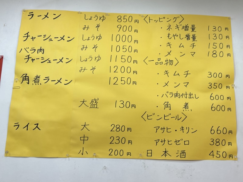 店内はカウンターとテーブル2つとコンパクトな造りです。メニューもシンプルでラーメン、チャーシューメン、バラ肉チャーシューメンのしょうゆとみそ、角煮ラーメンとこちらもシンプルです。今回はオーソドックスなしょうゆラーメンに。