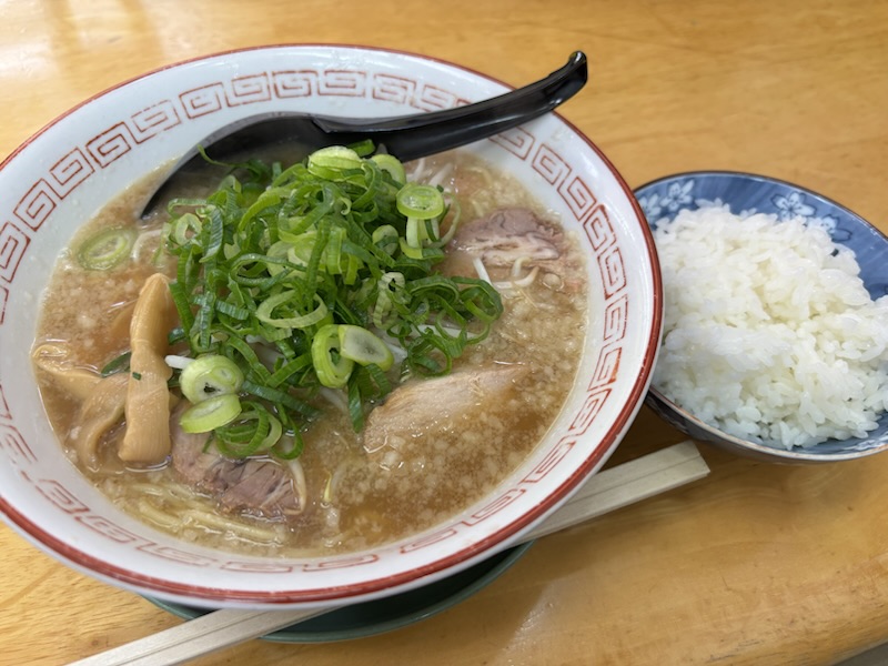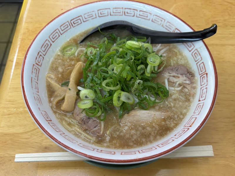 具はシンプルでネギ、メンマ、チャーシューにしょうゆのスープに背脂が浮いてます。麺はやや柔らかめの中太ストレート麺で京都ラーメンですね,古そうな店構えですが若そうなご夫婦でやられており、年越しラーメンや豚骨おでん🍢など新たな試みもされているようです👍