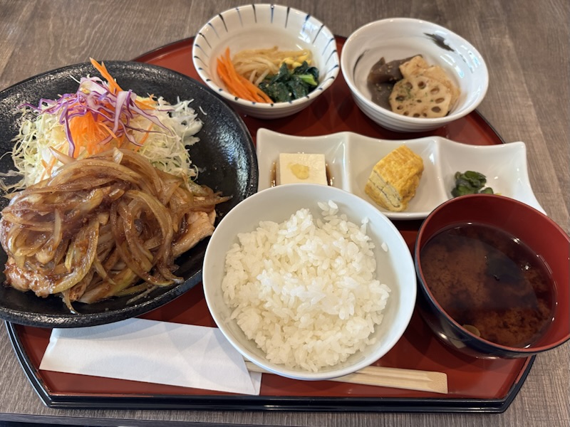 先にメイン以外のおぼんがやってきます。ご飯とお味噌汁の他に人参・モヤシ・ほうれん草のナムル、こんにゃく・筍・蓮根の炊いたん、やっこ、卵焼き、お漬物です。お味噌汁も出汁がきいてて美味しかったです。あとからメインのお皿がやってきます。しょうが焼きですがタレは甘さ控えめでご飯が行けるやつです。お肉もボリュームがありました。