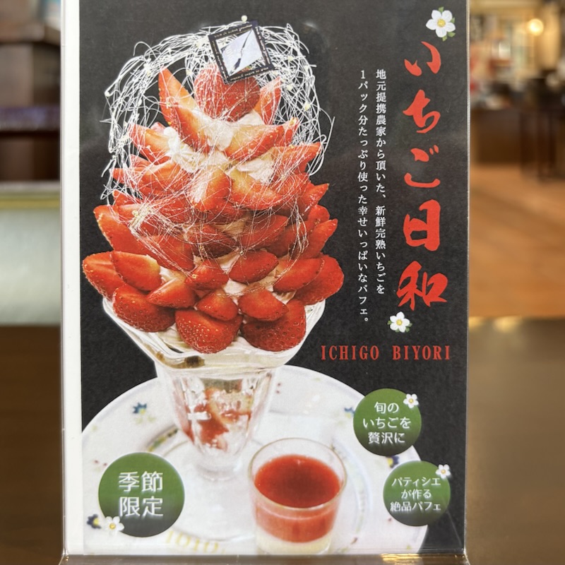 凄いですね、さすが地元農家から取り寄せた新鮮完熟いちごを1パックまるまる使ったいちごパフェ「いちご日和」これは凄いです。飴細工、生クリーム、バニラアイス、カスタードクリーム、シュトロイゼル、シェノワーズ、クランブルカカオ、ライチゼリーがイチゴを引き立てるそうです。隣の城っぽい建物と関係ないですがこのパフェの通し柱として中にバナナが一本通っています(笑)