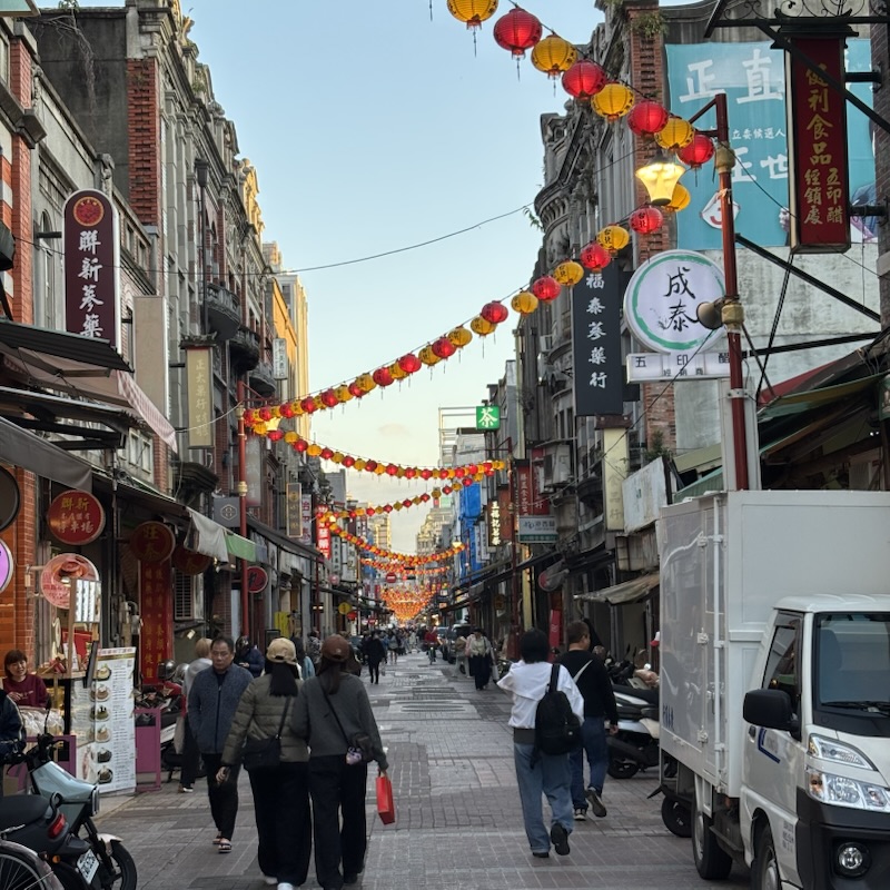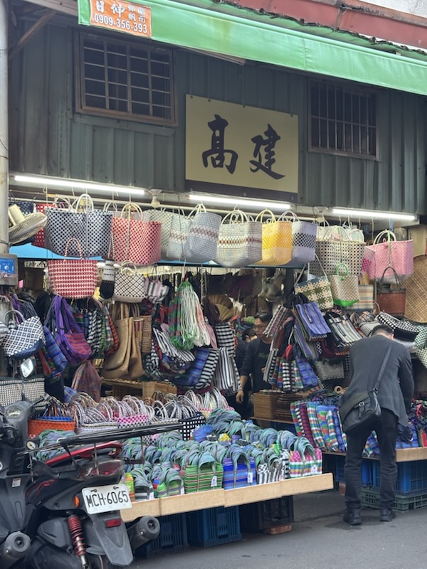 この後、悠遊カードで15NTDで乗れる(ジェットコースターのような)路線バスにのって迪化街に移動しました。迪化街は乾物屋さんの集まった街で昔来た時もふーんっといって二度と足を運ばなかったのですが今回は漁師バックを買いたいらしく高建桶店行ってきました。漁師バック200NTDを買ってご機嫌そうでした。