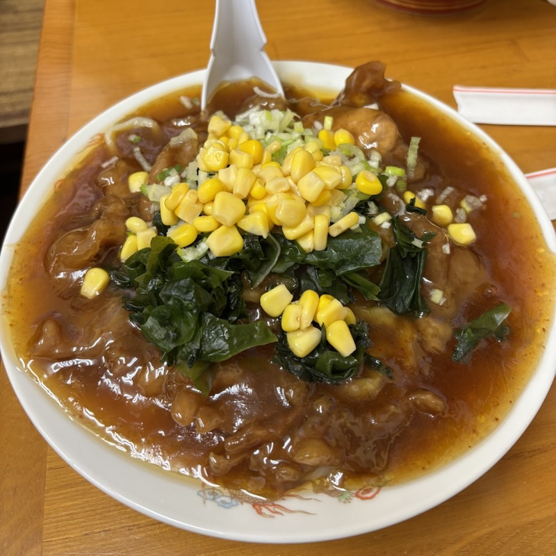 来ました。ラーメンと違って冷やしはどんぶりはなく皿で提供されるようです。うどんのような極太麺が冷水で〆められており、アツアツの餡がのっています。スタミナのレバーではなく揚げたお肉が甘い(黒酢のような)餡に絡まっておりネギ、コーン、わかめが載っています。このわかめとコーンがかなりいい味を出しています👍案は甘い中にもピリっと辛さ🌶ありますので食欲がそそり、箸は進むのですがなんせ並みでも量は多いです。