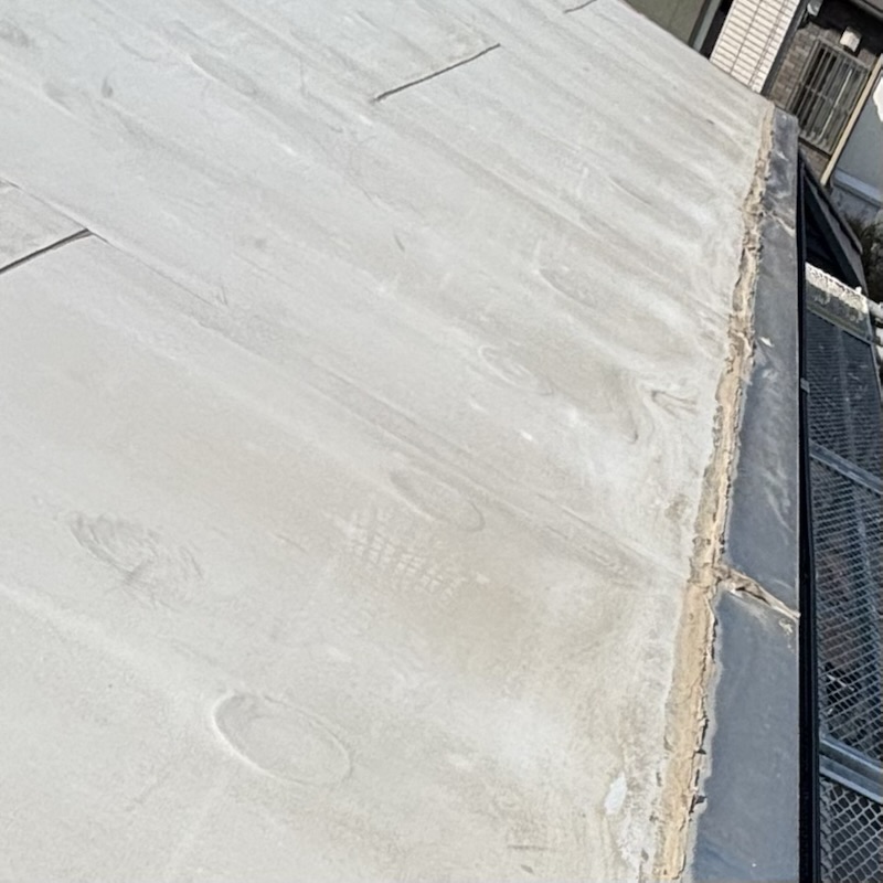 ワンダーデバイスを建てるときに屋根をビニール葺きかガルバ葺きか選べたのですがどちらも寿命はそう変わらない、ガルバは雨の時にうるさい、おまけに値段も高いということでワンダールーフと呼ばれるビニール葺きにしました。しかし15年の月日を経てビニール基材がところどころ黒ずんできているのと周辺のコーキングがボロボロになりつつあるのでまだ野地板は傷んでいないが傷む前に上からガルバを張る方が得策と伺い今回、手を入れることにしました。