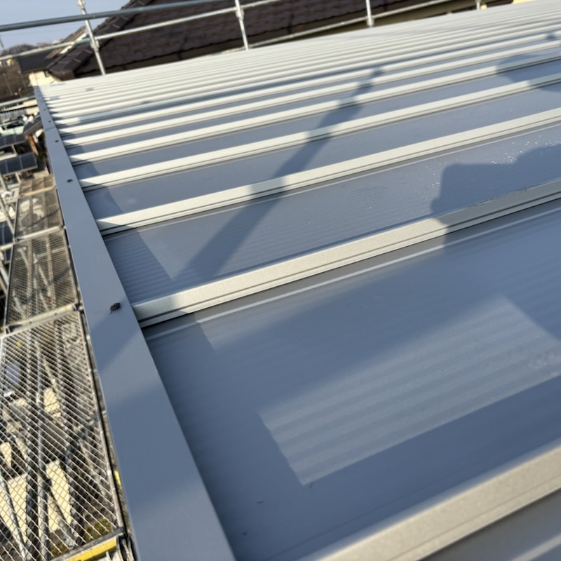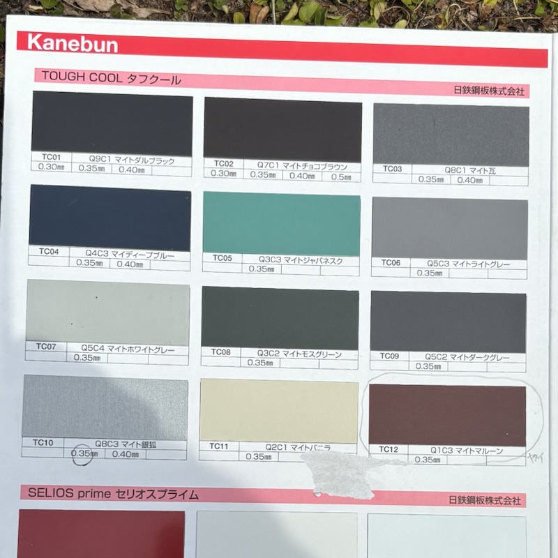 屋根材は日鉄鋼板のタフクールにしました。色は屋根が暑くならないようマイト銀狐にしました。SGLなのか普通のガルバにウムなのかはよくわかりませんでしたがニクスというやつより傷などが目立ちにくいとのことでした。