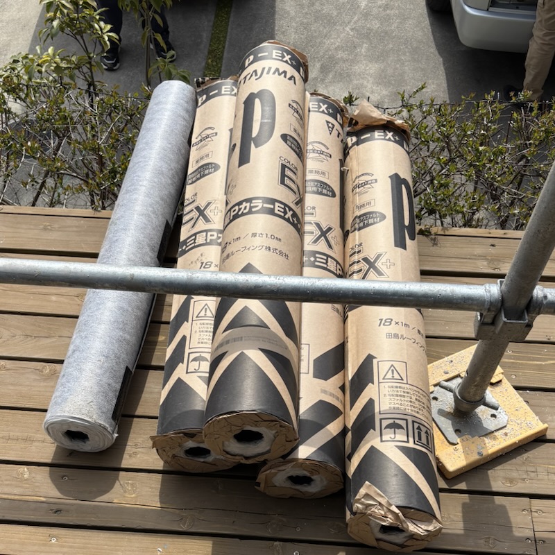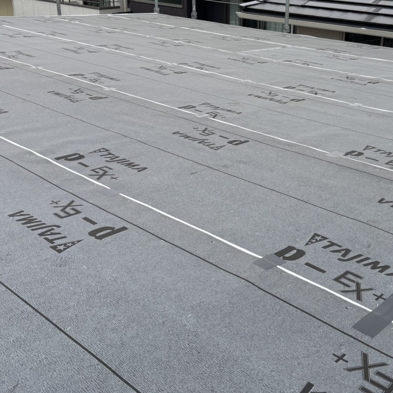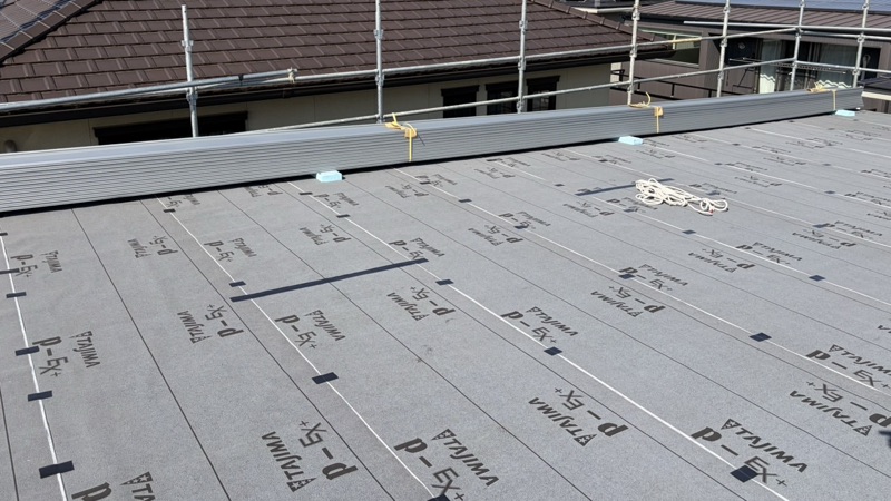 板金の下はワンダールーフの上からルーフィングを張ります。タジマのP-EX+を敷いていましたがこれは改質アスファルトルーフィングで20年以上の耐久性、もう一つ上の耐用年数が30年以上のニューライナールーフィングでもよかったかもしれませんね。この後、クレーンでガルバを上げてもらいました。