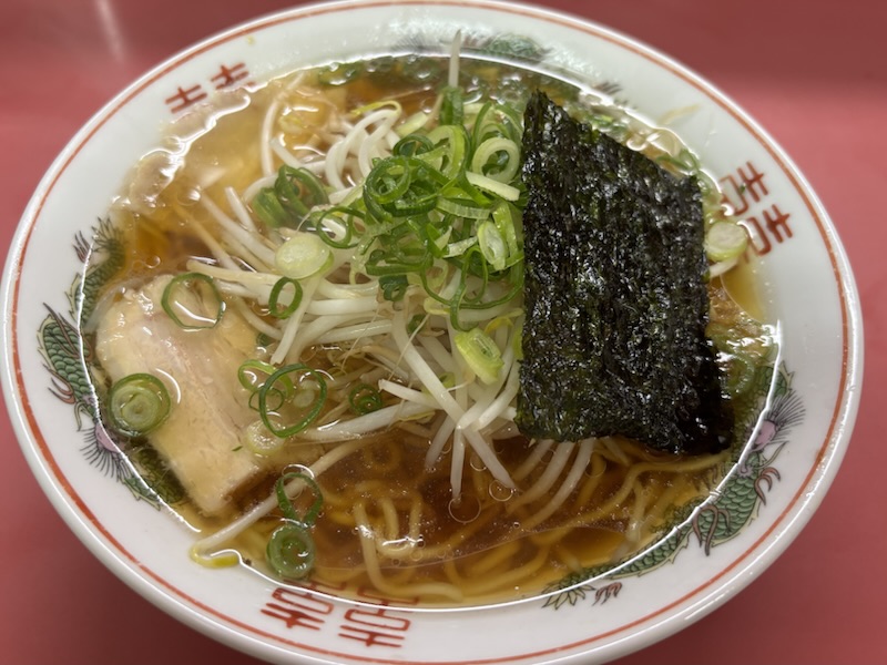 「熱いですよ~」とカウンターから丼を渡されましたがスープも丼もアツアツでした。播州ラーメンらしく甘ーいスープで具はチャーシュー、ネギ、モヤシ、海苔といたってシンプル。中太ストレート麺で典型的な播州ラーメンのそれです。