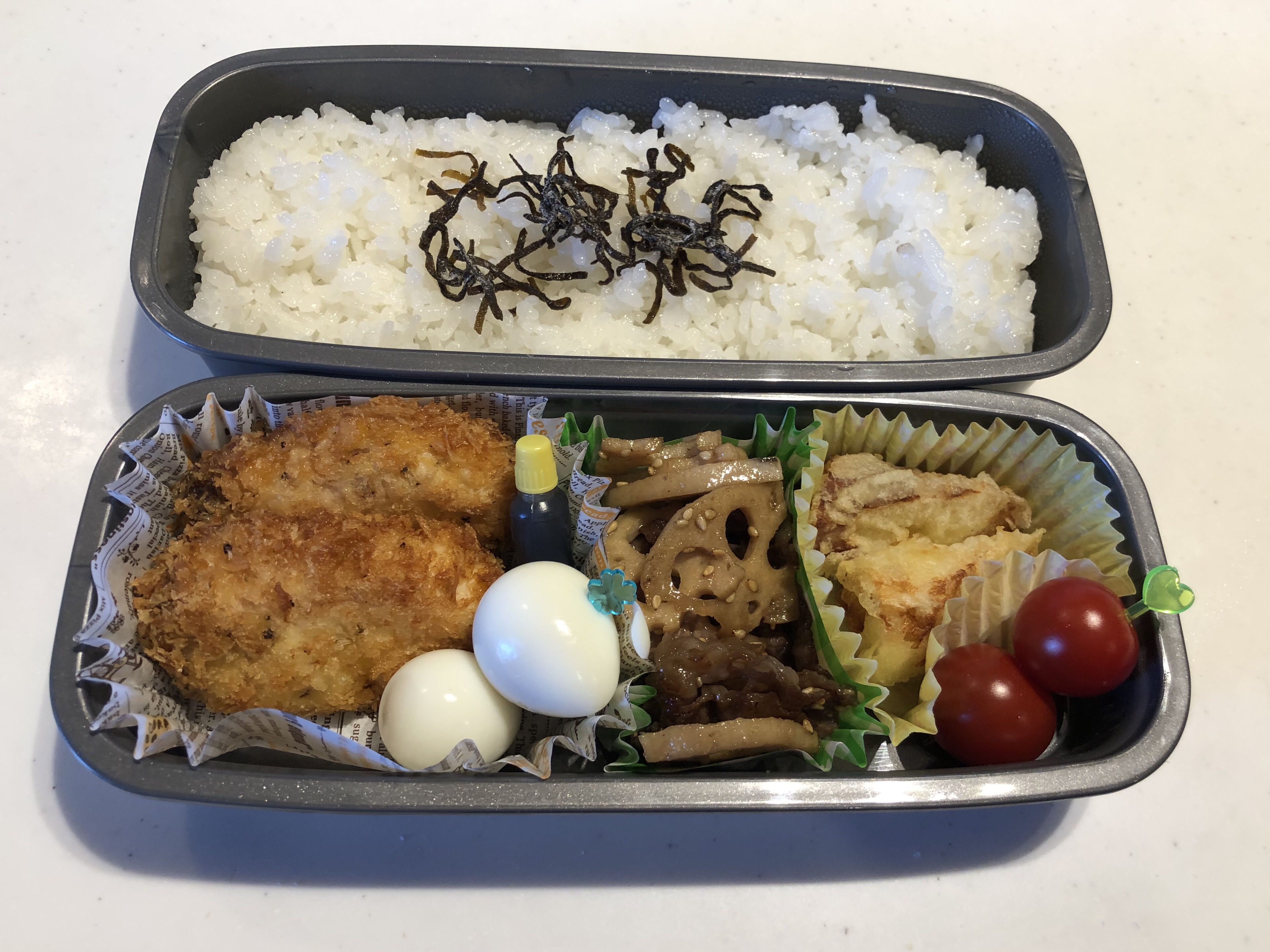 シイラのフライに牛肉とレンコンのきんぴら弁当。急遽お弁当と聞いたのでシイラは昨夜の夕飯のムニエルから少しとりわけ、初めてフライにしてみたけど、、、どうかなぁ。