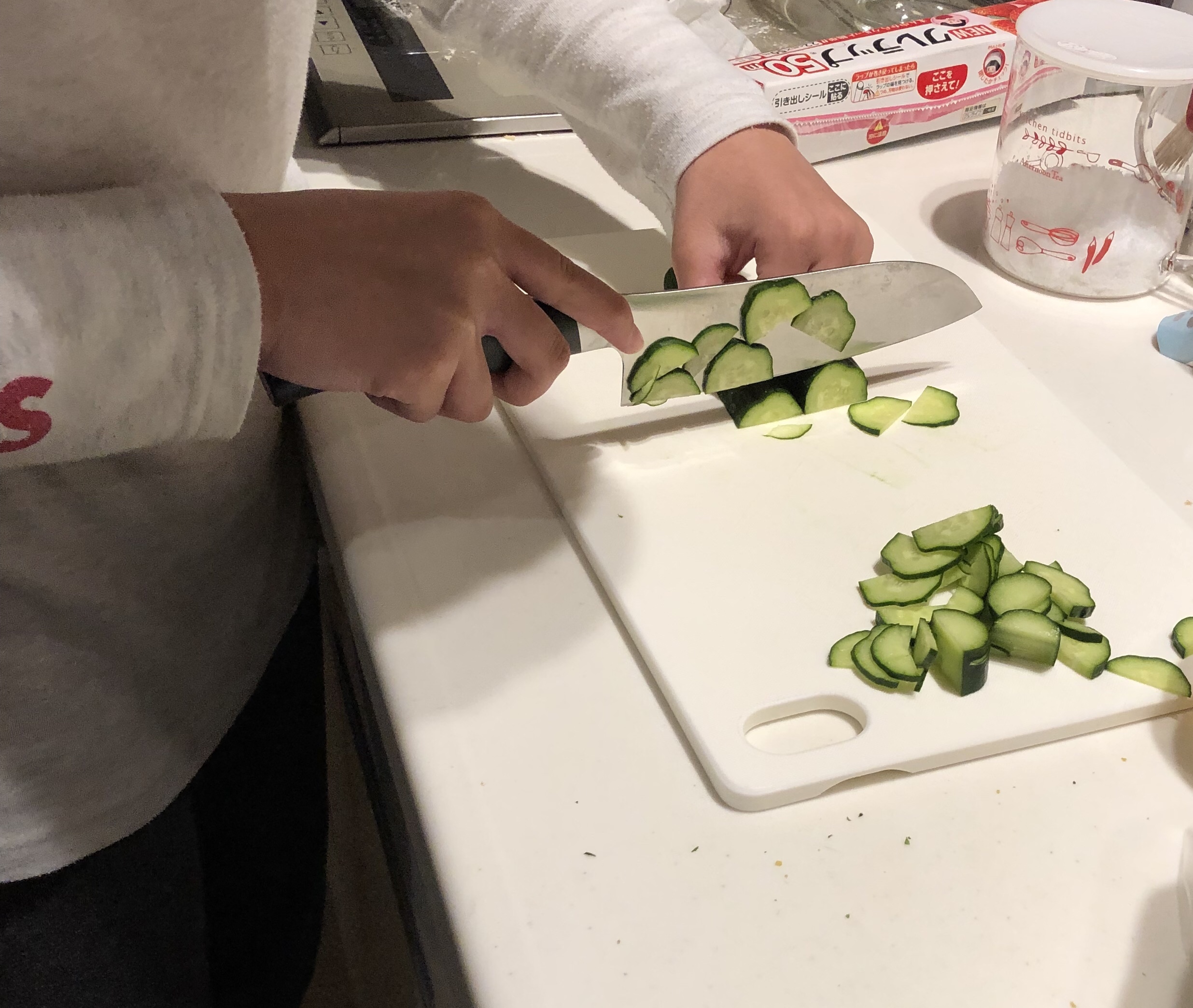 ムスメ、今日は家庭科でキュウリの薄切りテストがあるって事で週末は練習。