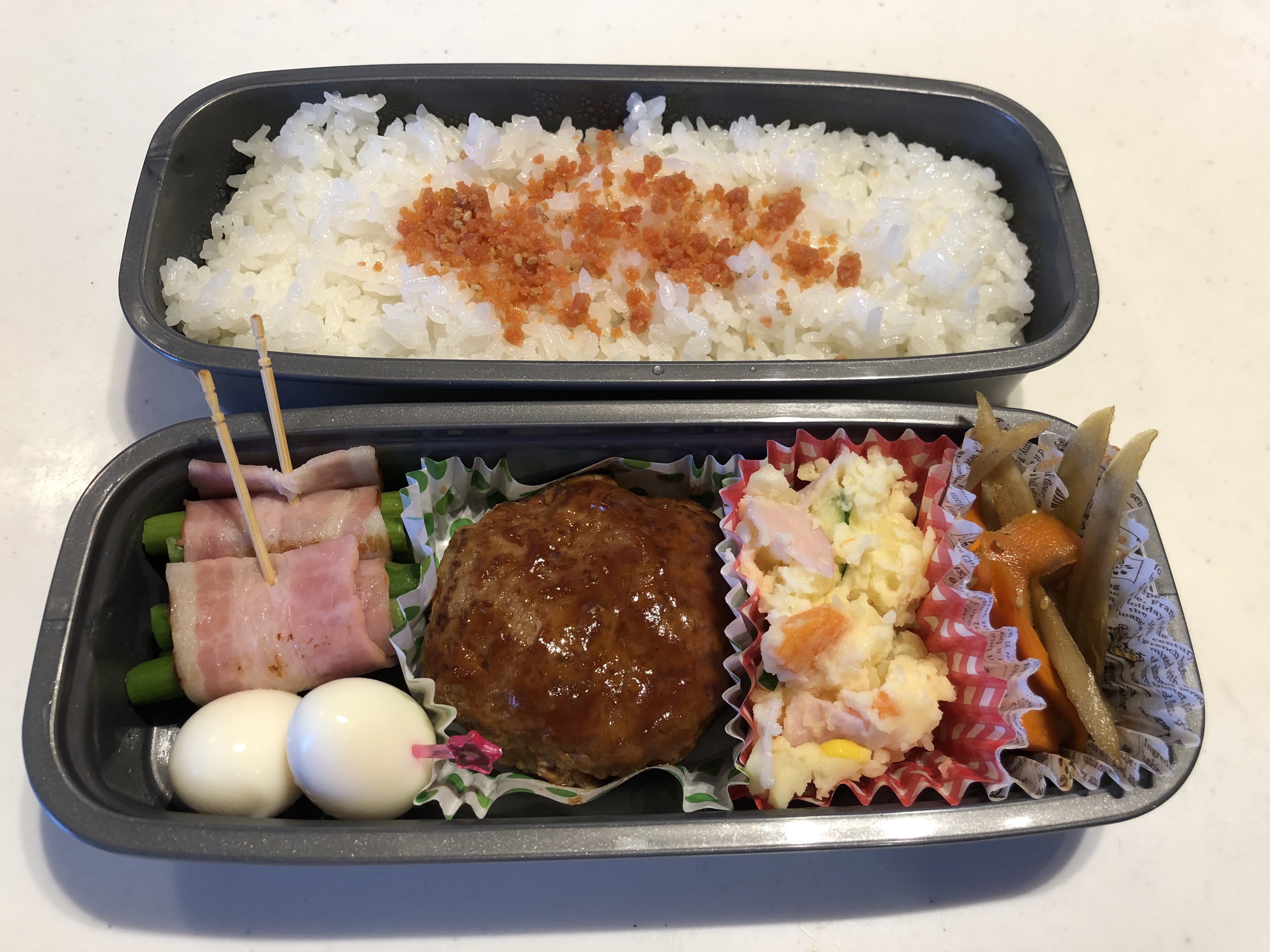 久々にハンバーグ弁当。我が家はハンバーグと言えばポテトサラダなのです(*^^*)