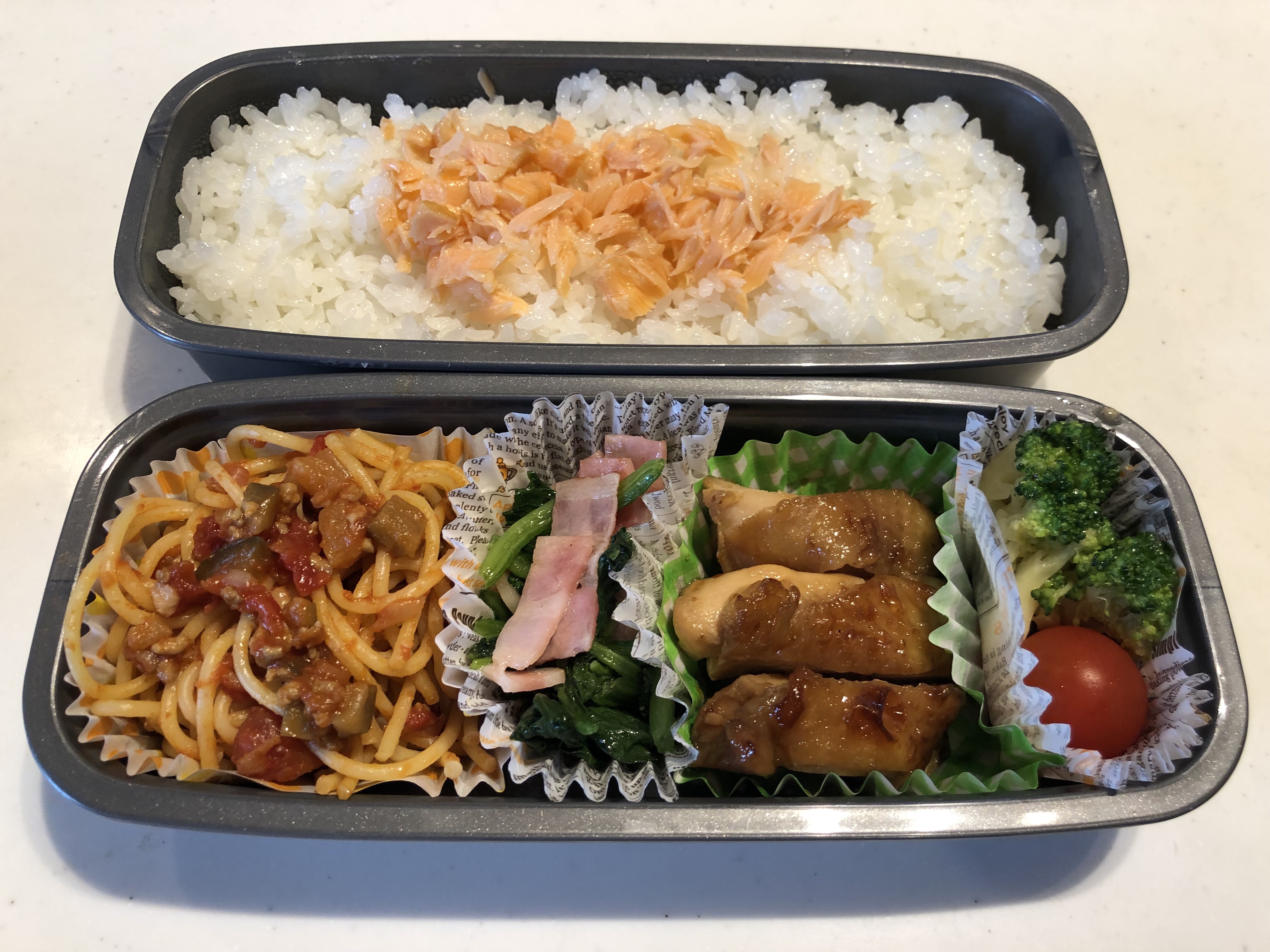 テリヤキチキンとミートソースのパスタ弁当。