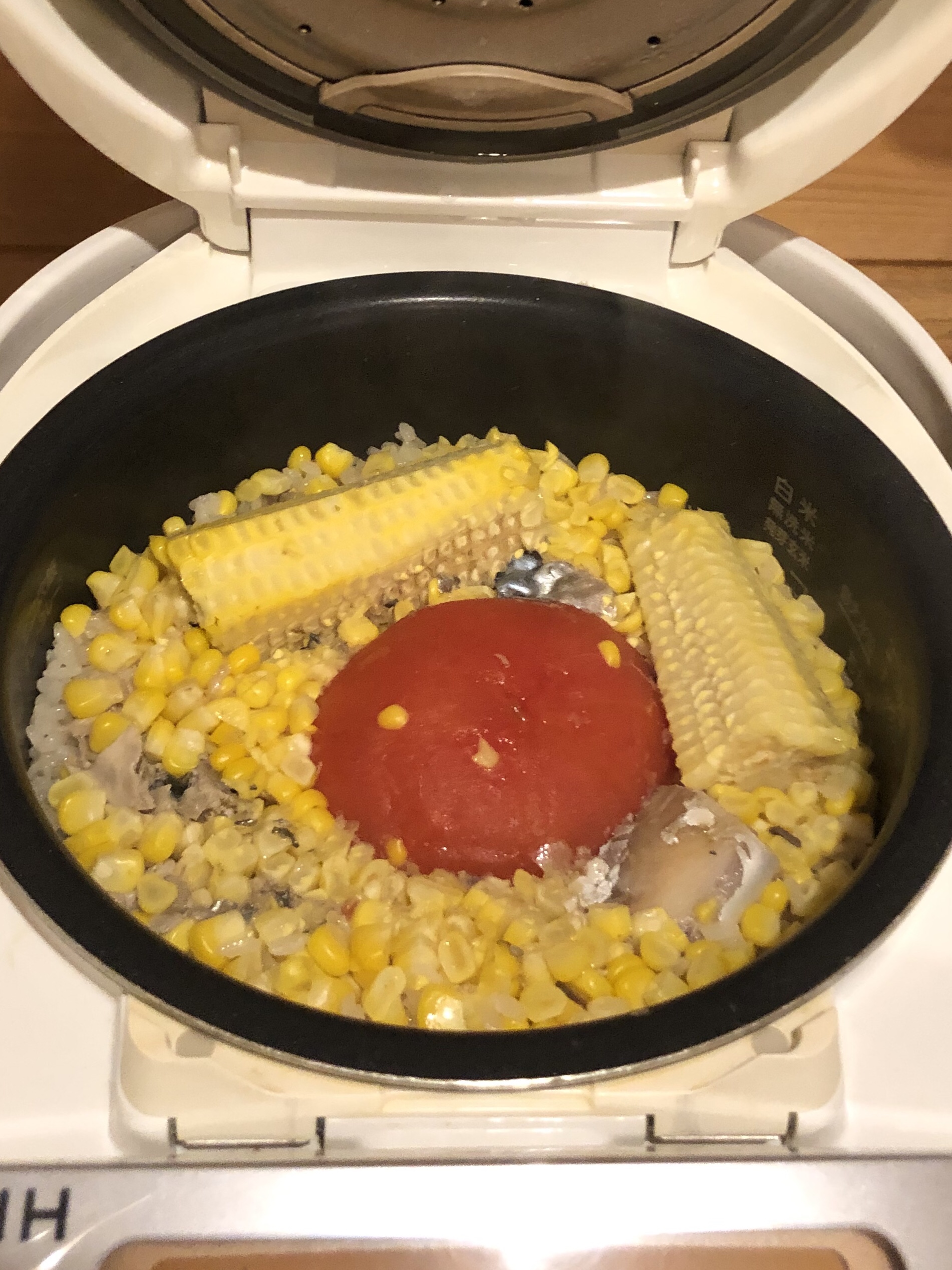 サバトマトご飯。、、、に、オットからコーンも入れて欲しいと言われコーンも投入。芯は炊き上がり後に出します。