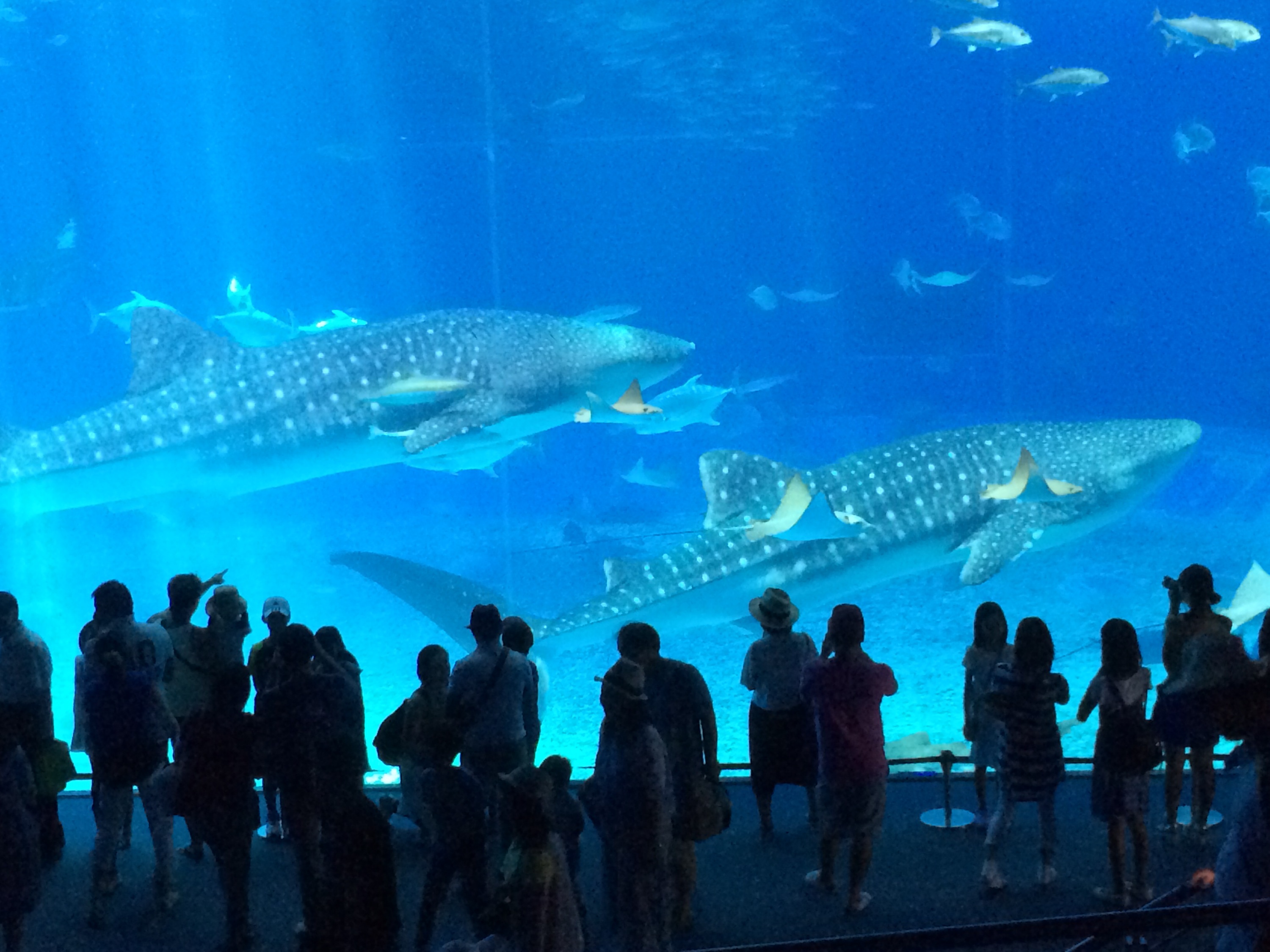 さてさて、3日目は移動。お世話になったお宿を出て、子ども達が楽しみにしている美ら海水族館へ。9時に到着したのにすでにそこそこの人が。これはまずいかも、とイルカショーが始まる30分前にショーの会場に行くとすでに7割ほどは埋まってる(^^;;11時のショーのスタート時には座れず立ち見の人がびっしり。平日でこれだけの人がいるんだから土日恐ろしいです。